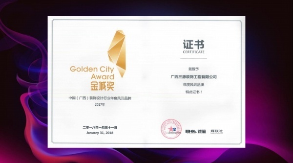 “金城獎(jiǎng)”是由廣西媒聯(lián)社以及各大主流媒體共同發(fā)起,旨在打造廣西南寧市最具榮耀性、思想性、廣泛性和高度力的城市大獎(jiǎng),榮獲該獎(jiǎng)項(xiàng)是業(yè)界對三源裝飾的肯定。三源裝飾將再接再厲,秉承以客戶為中心的服務(wù)理念不斷創(chuàng)新,實(shí)現(xiàn)公司健康穩(wěn)健發(fā)展,為城市建造增添新色彩。